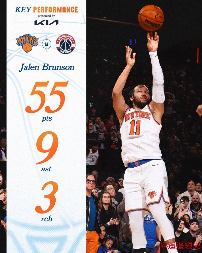 尼克斯(22-10):布伦森55分3篮板9助攻、唐斯30分14篮板3助攻、布里奇斯21分3篮板3助攻3抢断、哈特13分11篮板7助攻、阿努诺比9分4篮板