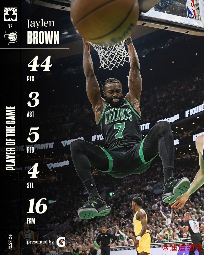 杰伦-布朗24投16中,皇冠现金网官网三分球11中6狂轰44分率队取得一场37分的大胜,凯尔特人终结连败稳居东部第二。